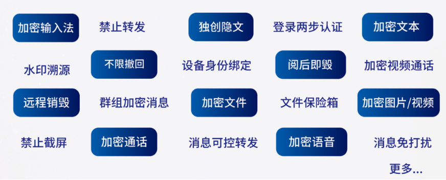通信卫士具备硬安全、高普适、广覆盖、全周期4个核心优势,覆盖加密输入、沟通协作、实时通话、加密存储、安全阅读、视频会议6大应用场景,提供加密输入法、不限时撤回、独创隐文、远程销毁、阅后即焚、加密文本、加密文件、加密图片/视频、加密语音、加密通线+核心安全功能。