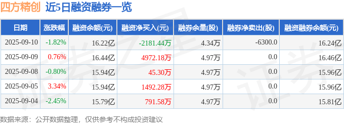 四方精创融资融券信息显示,融资方面,当日融资买入1.22亿元,融资偿还1.44亿元,融资净偿还2181.44万元。融券方面,融券卖出0.0股,融券偿还6300.0股,融券余量4.34万股,融券余额175.47万元。融资融券余额16.24亿元。