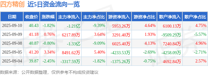 米兰体育官网证券之星消息,截至2025年9月10日收盘,四方精创(300468)报收于40.43元,下跌1.82%,换手率5.92%,成交量31.38万手,成交额12.84亿元。